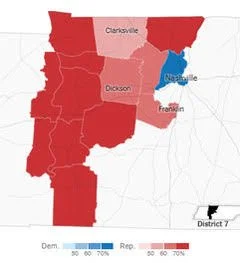 Tennessee’s 7th Congressional District includes 11 counties in their entirety and portions of 3 additional counties. The partial counties are clustered around Nashville in Davidson County and extend south into Williamson County.